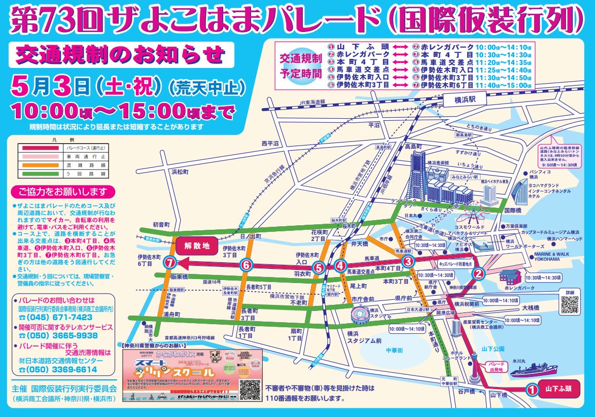 山下公園周辺からスタートし、横浜の中心部を華やかに彩るこのパレードは、毎年多くの来場者でにぎわう人気イベントです。
